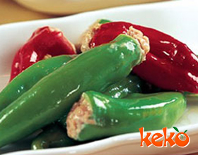 煎酿青红椒:'1.将虾仁去泥肠,加生粉洗净,拭干,切碎后加盐5克、味精5克,生粉2克搅拌至起胶,青椒、红椒切开去籽,切成5厘米*3厘米的块状;蒜头切茸;蒜切末。2...