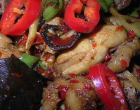 客家炒鸡块:'1.将鸡腿肉切块;2.九层塔切碎;3.辣椒洗净切片;4.炒锅注油烧热,下入葱、姜爆香,放入鸡腿煸炒,加入豆瓣酱、白糖炒入味,放入九层塔、辣椒片翻炒均...